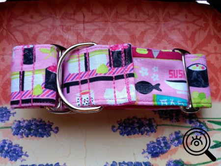 Collar de nylon folrat amb tela amb motius culinaris japonesos "sushi" i peces reforçades.